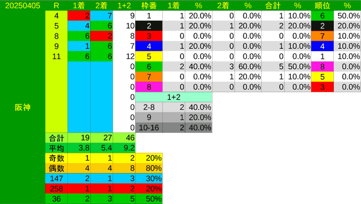 前日の阪神芝は全5レース。6枠が5レースのうち4レースで5頭が連対し連対率は80%(4R/5R)で占有率は50.0%(5頭/10頭)。次に多かったのは2枠で、連対がなかった枠は3.5.8枠。前日のレースは6枠が好調。