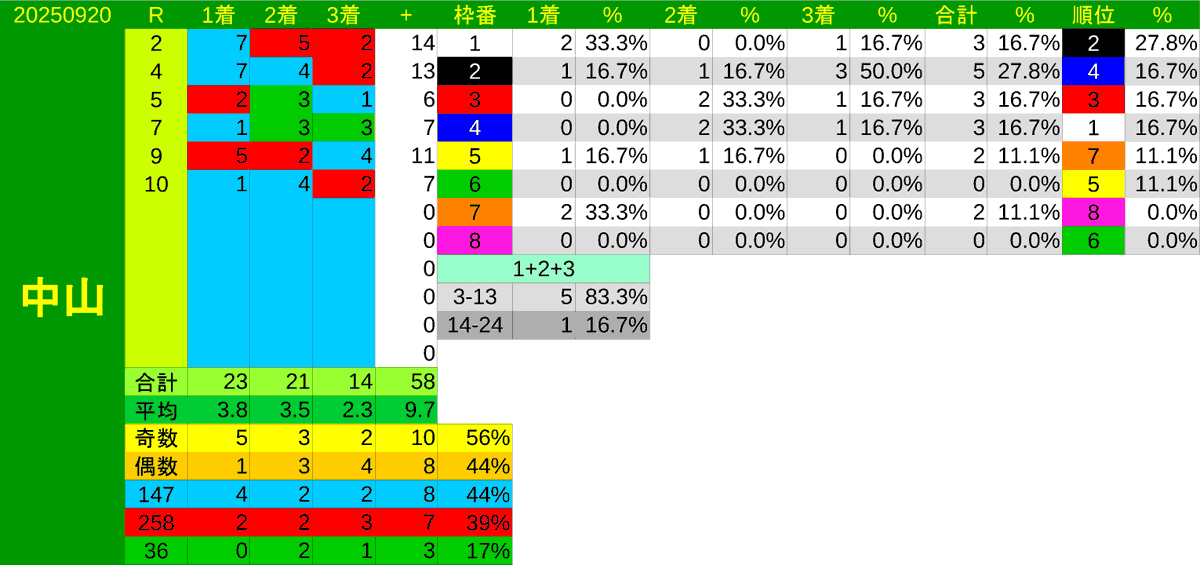 前日の中山芝は全6レース。2枠が6レース中5レース5頭が3着内に入っており複勝率は83%(5R/6R)で占有率は27.8%(5頭/18頭)。次に1枠と4枠が3レースで3頭が入っており、3枠は2レースで3頭が入っていた。5枠と7枠が2回2頭ずつで3着内がなかった枠は6枠と8枠。前日のレースでは2枠を筆頭に内枠が優勢!!