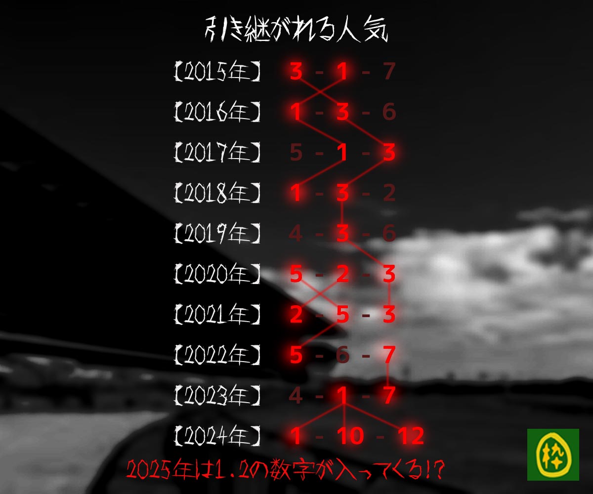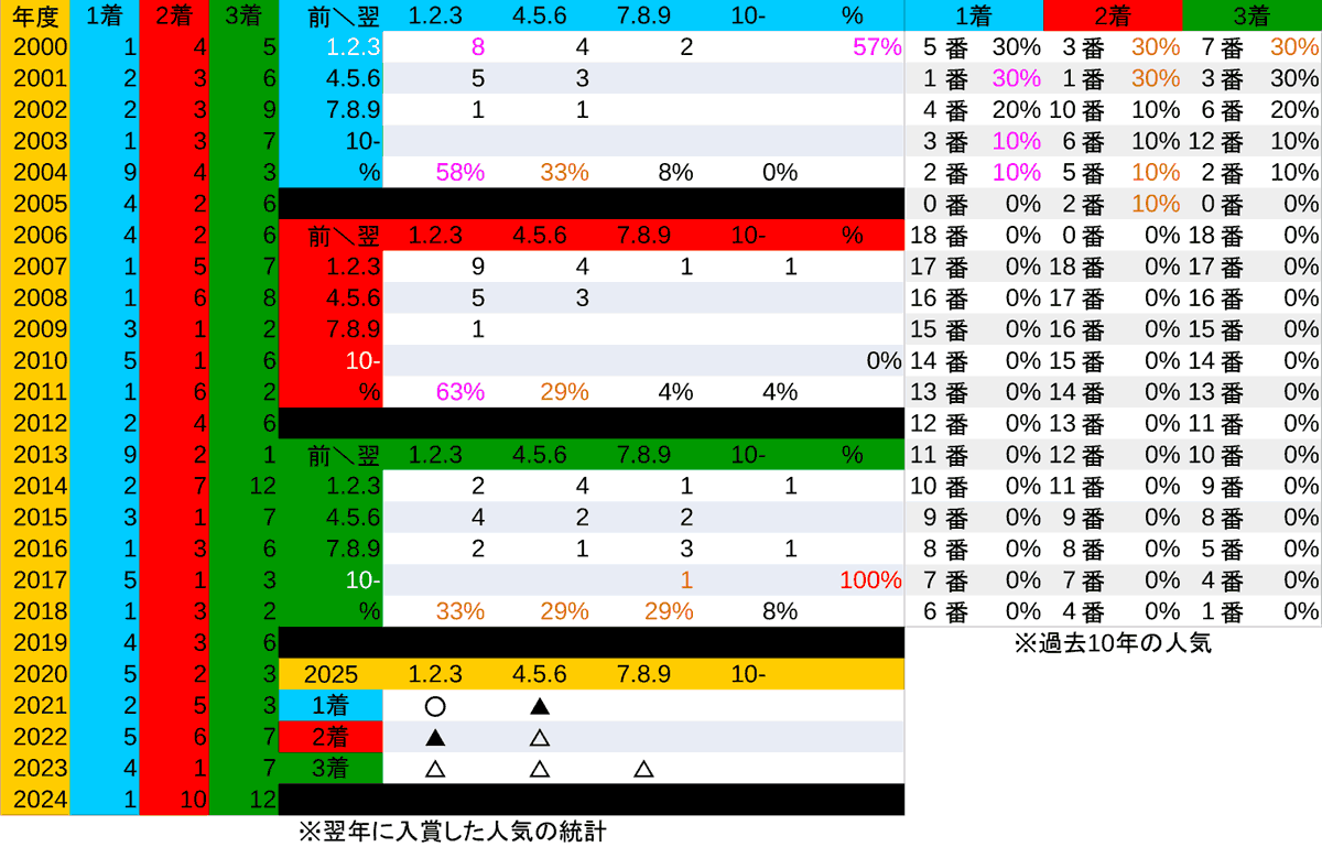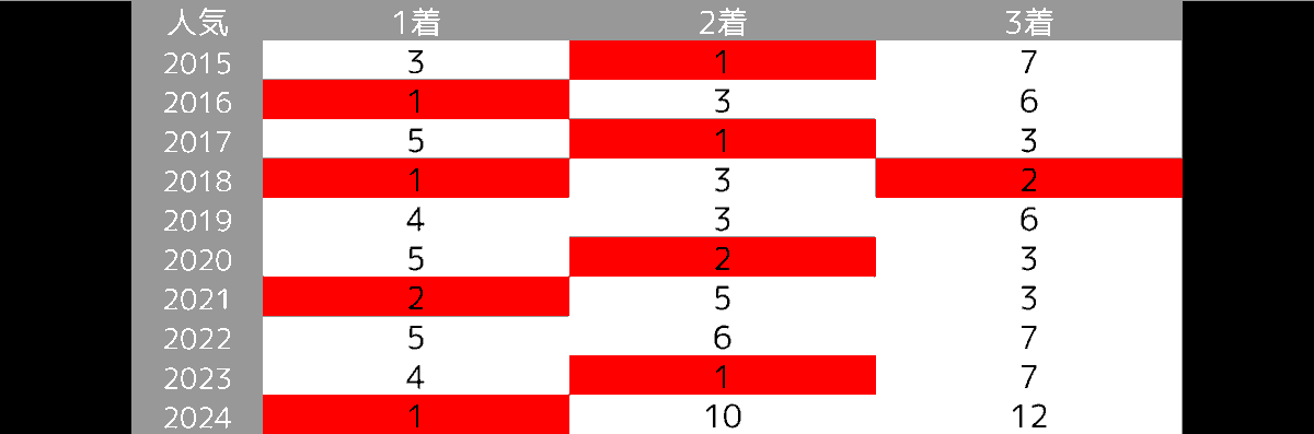 【1ケタ人気】で過去10年で3着内に入っていない人気は8番人気と9番人気。【2ケタ人気】は過去10年間では去年2024年の2着に10番人気のアウスヴァールと3着に12番人気のリカンカブールが入っているが、この2頭のみなので2ケタ人気の馬には難しいレースと言えるだろう