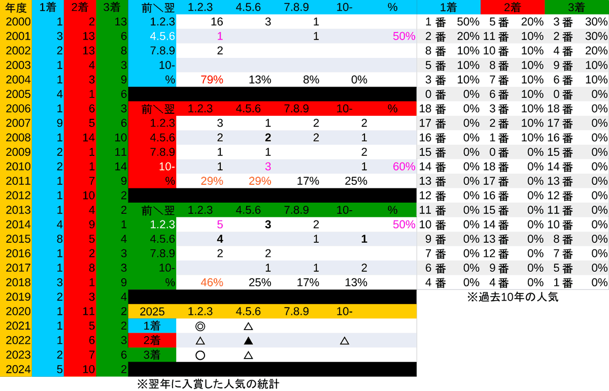 ※「複勝馬の過去10年の統計データ」の”人気”欄参照