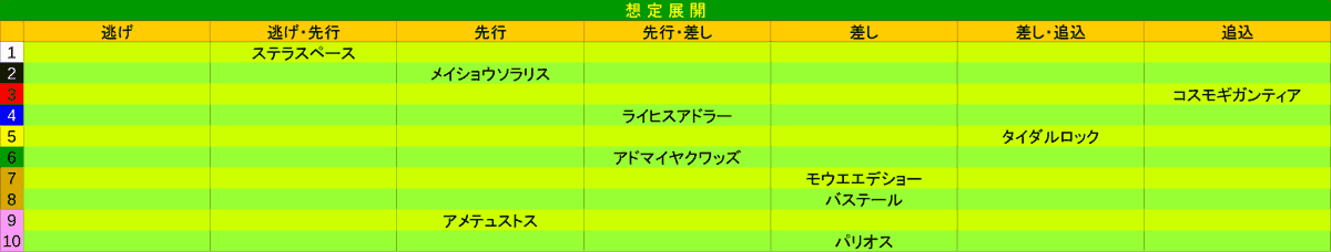 ステラスペースが内枠を利してハナへ。メイショウソラリスがピタリと2番手につけ、アメテュストスが好位3番手を確保。中団でライヒスアドラーとアドマイヤクワッズが虎視眈々と前を射程圏に入れ、後方ではバステール、バリオス、モウエエデショー,コスモギガンティア、タイダルロックが脚を溜めると想定