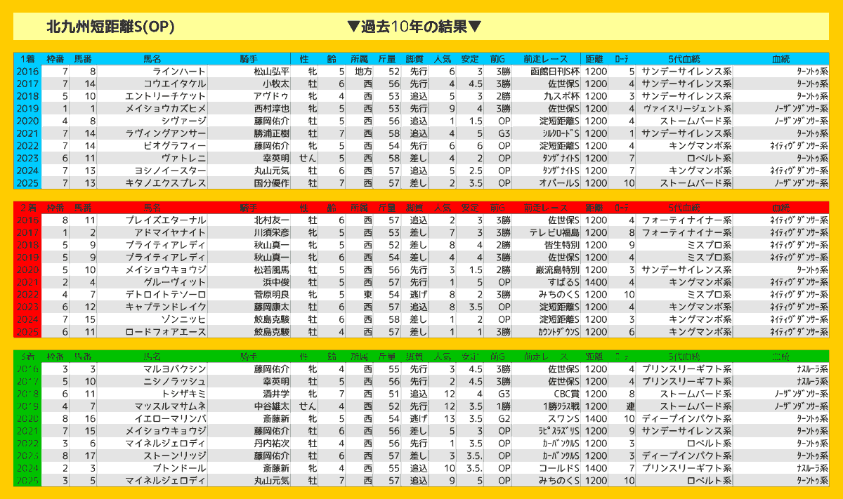 北九州短距離ステークスの過去10年のレース結果