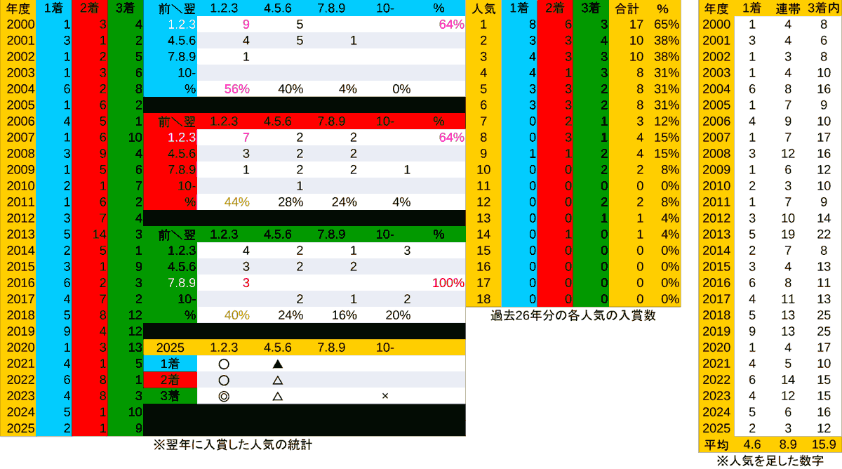 ※「複勝馬の過去10年の統計データ」の”人気”欄参照