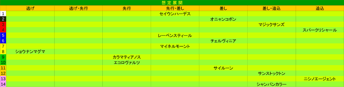 今回のメンバー構成は「逃げ馬」がはっきりしており、開幕週の馬場も相まって「先行〜好位」組が有利に進めることが想定されるが、ペースが速くなれば「差し・追込」の実力馬が飲み込む可能性あり
