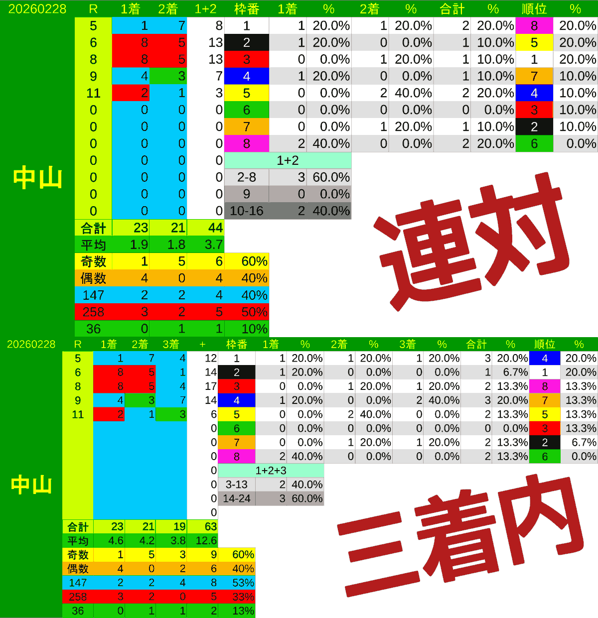 前日の中山芝は全5レース。三着内では1枠と4枠が5レース中3レース3頭が3着内に入っており複勝率は60.0%(3R/5R)で占有率は20%(3頭/15頭)。次が3.5.7.8枠で5レース中2レース2頭が3着内に入っており複勝率は40.0%(2R/5R)で占有率は13.3%(2頭/15頭)。前日3着内が無かった枠は6枠のみ。連対は1.5.8枠が好調。連対と三着内の両方でトップとなった1枠が最好調枠。