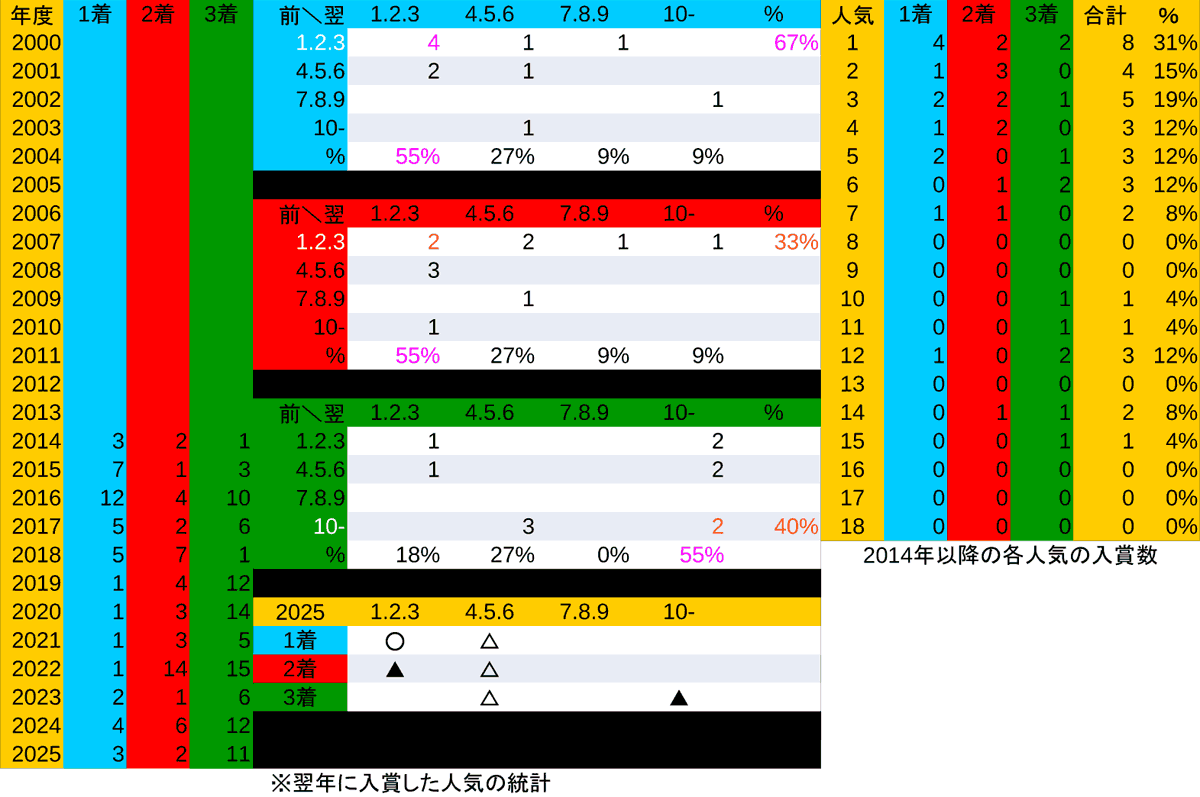 ※「複勝馬の過去10年の統計データ」の”人気”欄参照