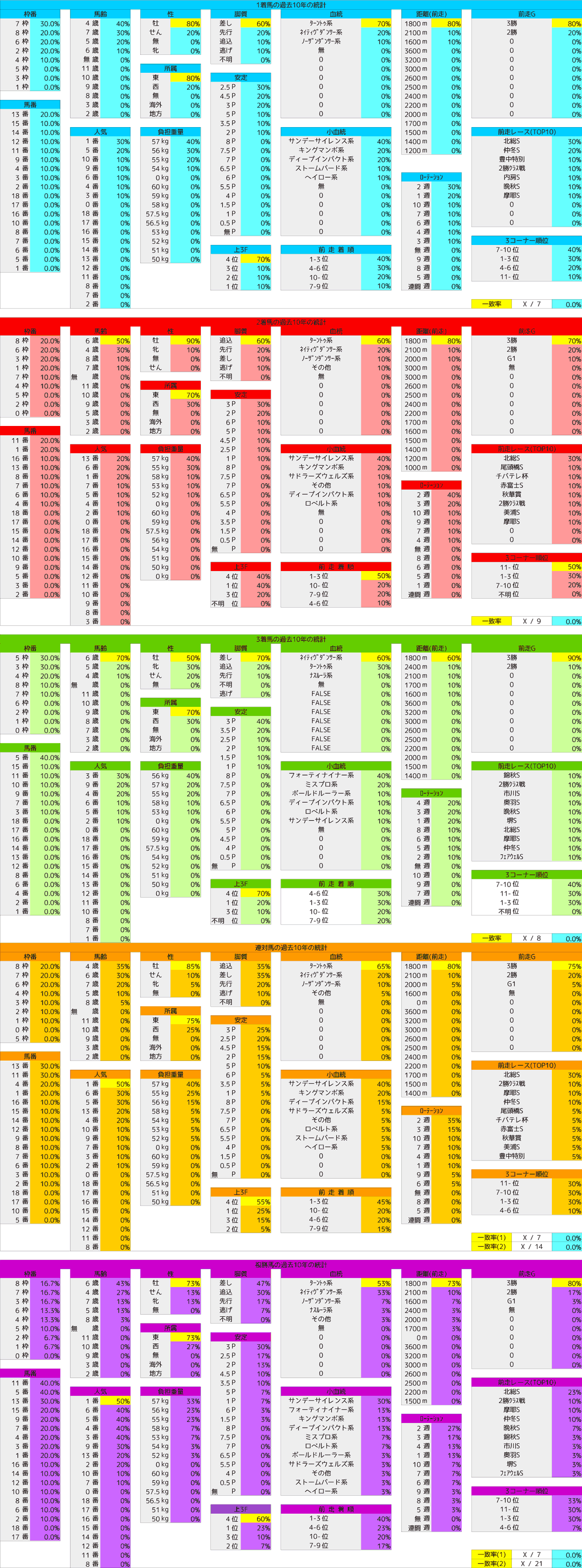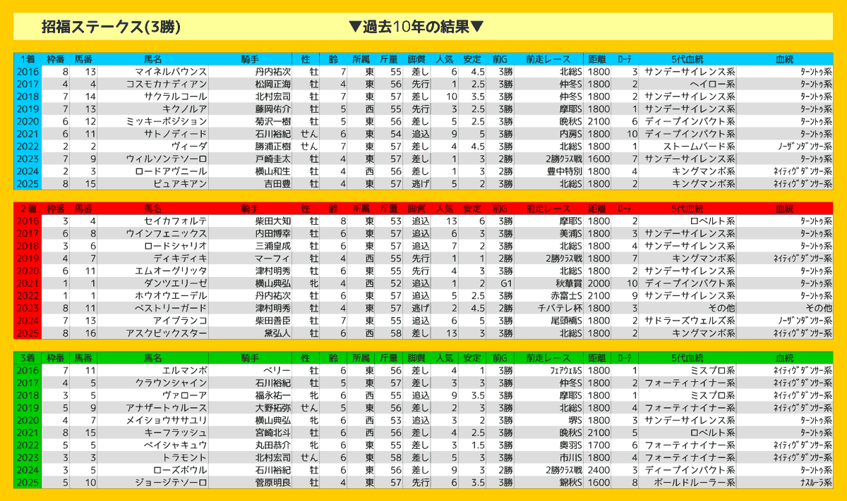 【1ケタ人気】で過去10年で3着内に入っていない人気は8番人気のみ。【2ケタ人気】は2016年の2着に13番人気セイカフォルテ、2018年の1着に10番人気サクラルコール、2025年の2着に13番人気アスクビックスターが入っている。決して数は多くないが、2着に13番人気が2回も入っているので念のため13番人気の馬は絡めておきたい