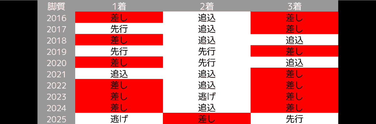 | 2024 | 逃げ | 差し | 先行 |