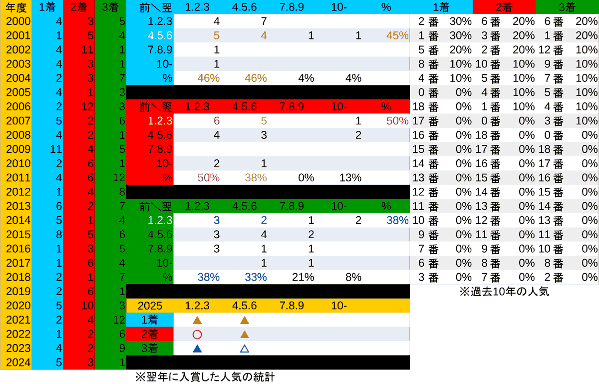 ※「複勝馬の過去10年の統計データ」の”人気”欄参照