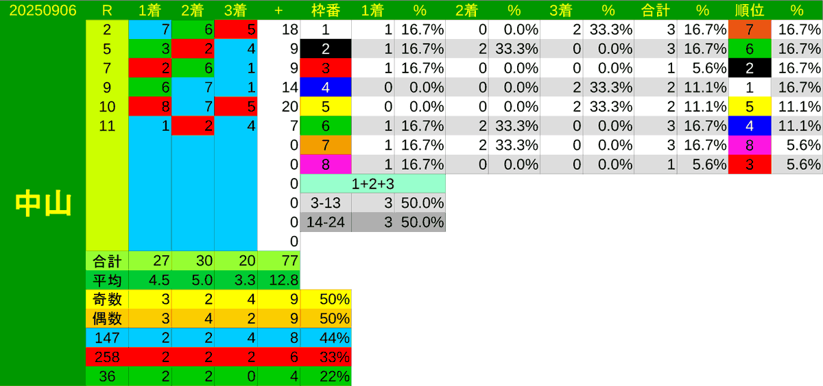 前日の中山芝は全6レース。1.2.6.7枠が6レース中3レース3頭が3着内に入っており複勝率は50%(3R/6R)で占有率は16.7%(3頭/18頭)。次に4枠と5枠が2レースで2頭が入っていた。3枠と8枠が1回1頭ずつで3着内がなかった枠は無し。前日のレースでは1.2.6.7枠がやや好調。
